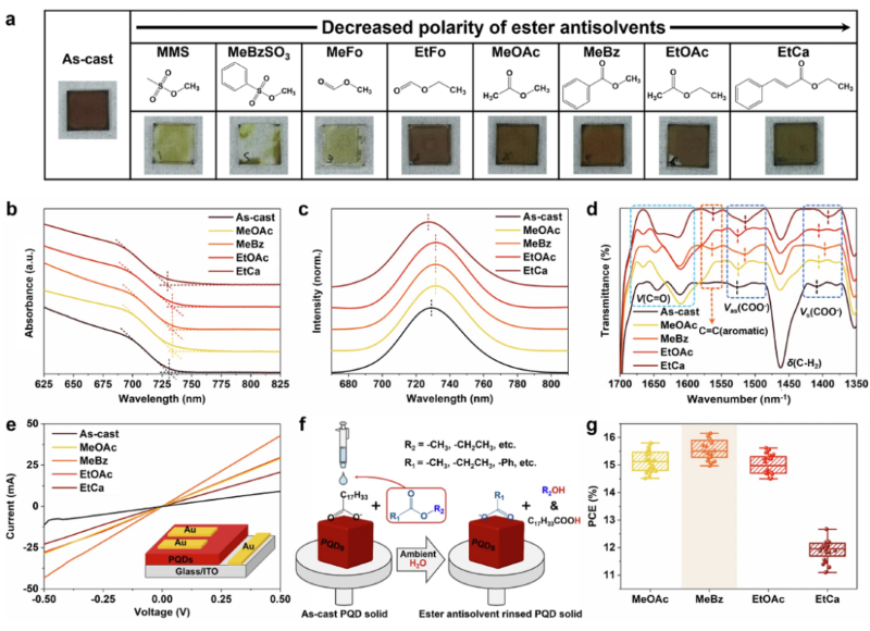 通過探討極性不同的酯類反溶劑對PQD薄膜形貌、光學性能的影響甄選合適反溶劑。酯類反溶劑水解得到的短配體顯著影響PQD薄膜導電性及其器件性能,酰基端帶有共軛苯環的MeBz能夠水解得到電荷傳輸性能更佳的苯甲酸根(BZA-)配體,比傳統MeOAc更適合作為潤洗PQD薄膜的反溶劑(圖d-g)。