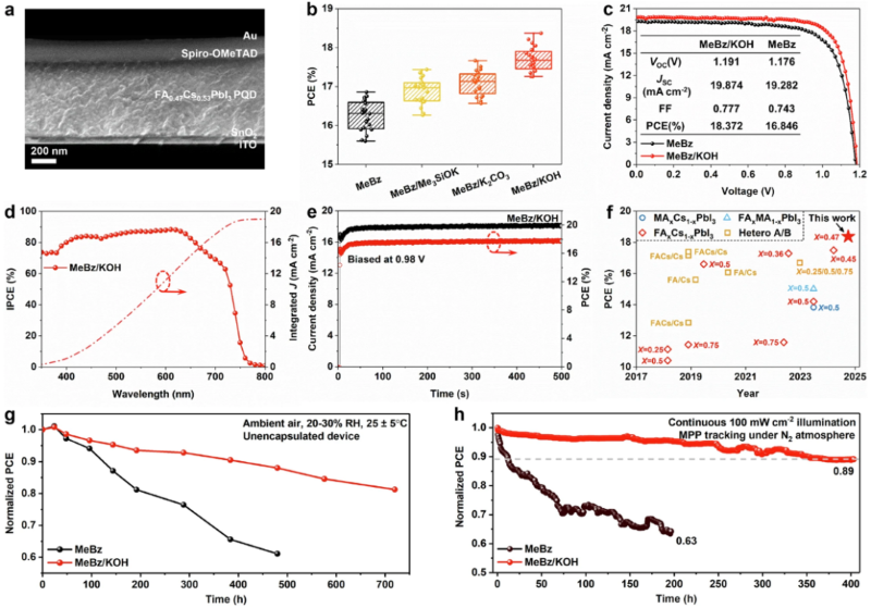 器件性能隨采用的MeBz/堿反溶劑體系pH值的增加而增加。小尺寸(0.036 cm2)器件實驗室自測效率*高可達18.37%,認證效率為18.30%,為目前已發表量子點太陽能電池研究中的最高認證效率;大尺寸(1 cm2)器件效率為15.9%;穩態效率為17.85%(圖a-f)。