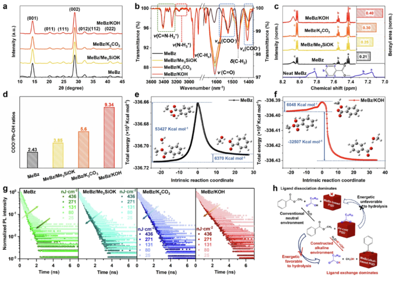 采用堿性添加劑促進高效酯類水解用于PQD配體交換;理論計算證實,堿性環境可使酯類水解在室溫條件下充分自發進行,并使反應活化能降低約9倍(圖e-f)。通過梯度堿度調節構筑適當的堿性環境,確保PQD表面導電封端的完整性,避免形成陷阱態,有效改善材料光電性能(圖g-h)。