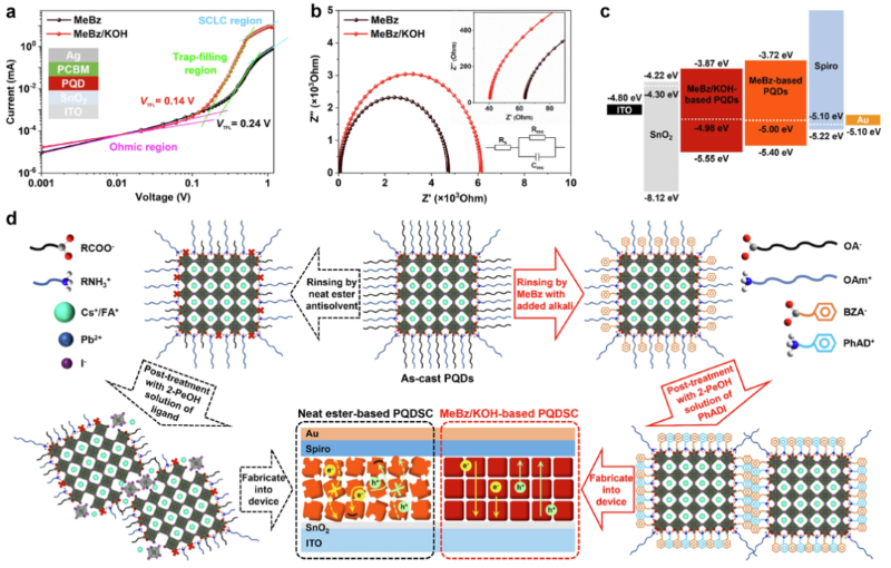 李教授團隊創新性構筑適宜堿性環境加速酯類反溶劑水解,實現高效配體交換。有效解決了傳統方法中,基于在低極性酯類反溶劑中添加極性陽離子配體鹽進行配體交換時存在的效率低下、過程不可控等問題,從根源改善 PQD 表面導電包覆完整性。團隊接著通過定制MeBz與KOH的組合用于PQD薄膜層間沖洗,逐層組裝制備的光吸收層具有缺陷少、晶體學取向均一、顆粒團聚少的優勢;最終構建的PQD太陽能電池實現了高達18.3%認證效率,為目前已發表量子點光伏器件研究中的最高認證效率。