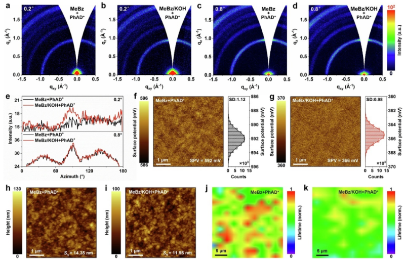 基于堿性環境的層間配體交換助力形成更完整的表面配體封端,在光吸收層制備過程中有效防止配體后處理A位配體交換過程對PQD晶格結構的破壞,使基于MeBz/KOH的PQD光吸收層從表面至體相的晶體學取向高度均一(圖a-e)?;贛eBz/KOH的PQD固體薄膜的形貌與PL映射分布更加均勻,表明堿性環境下進行層間配體交換有效減輕了光吸收層內相鄰PQD的團聚(圖f-k)。
